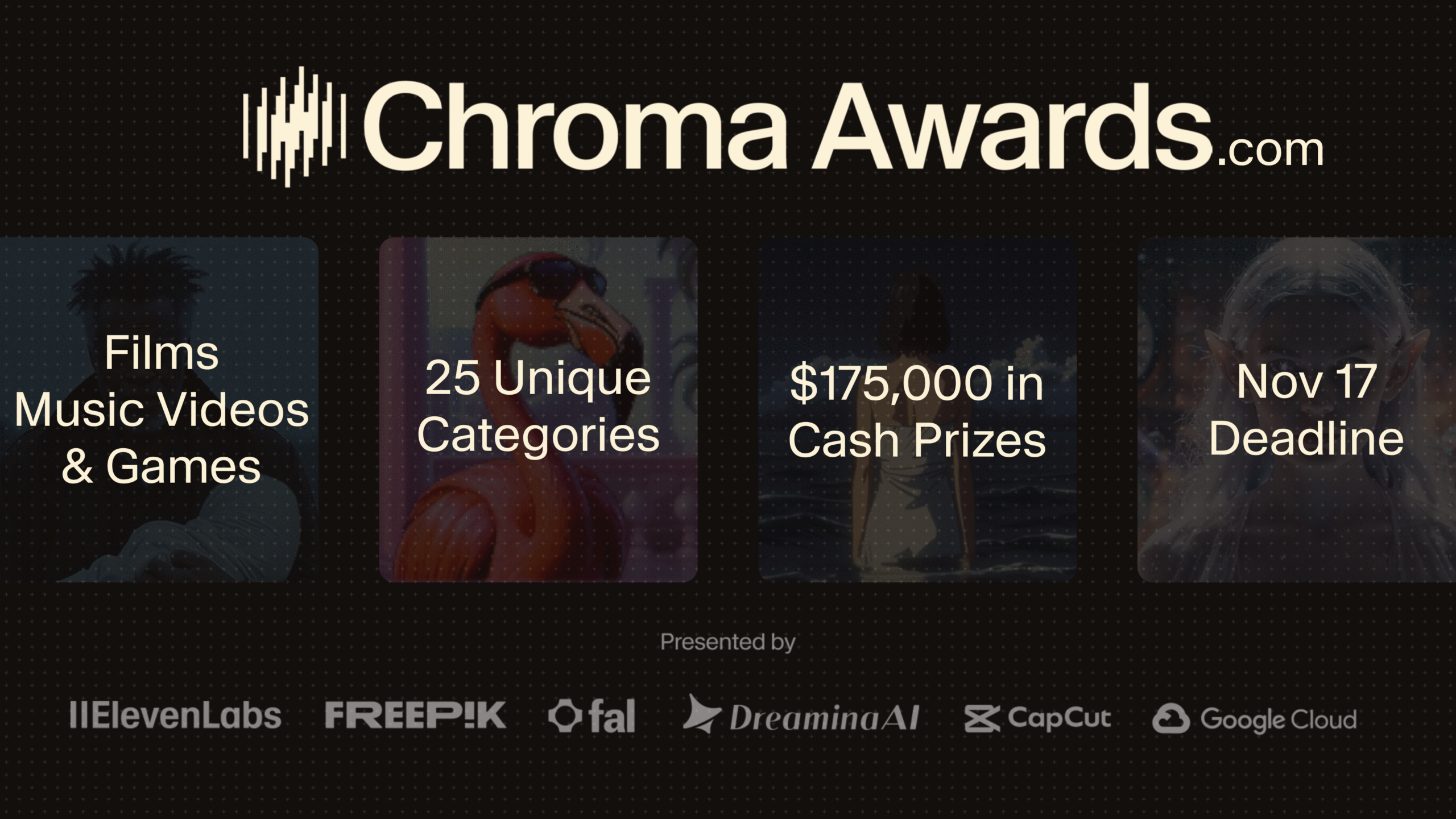 Over $175,000 in cash prizes across 25 different categories. Learn more at: https://chromaawards.com/info/prizes