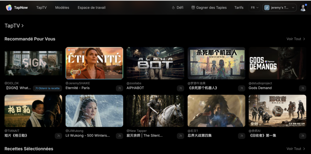 TapTV is TapNow’s creator community where you can explore outstanding works from creators worldwide. You can also open shared workflows, learn how a piece was made, and publish your own work.